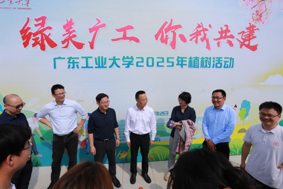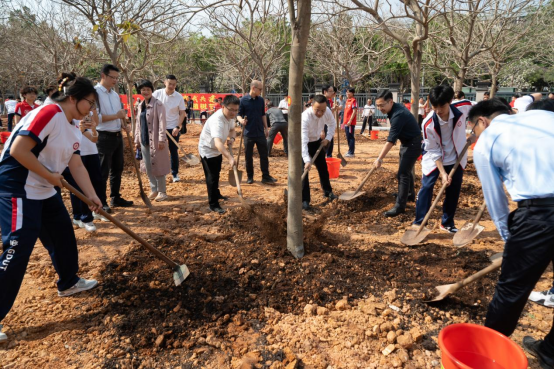 今天,校友代表梁智峰、谢伟锋、彭少辉、张荣华重返校园,同时校友也邀请了原学院辅导员、现学校党委统战部副部长林冰花共同参与植树活动,学院党委书记周建强、学院党委副书记陈颂坚等学院教师一同出席活动,与在校学生一起亲手植下新苗,为校园增添一抹新绿。
