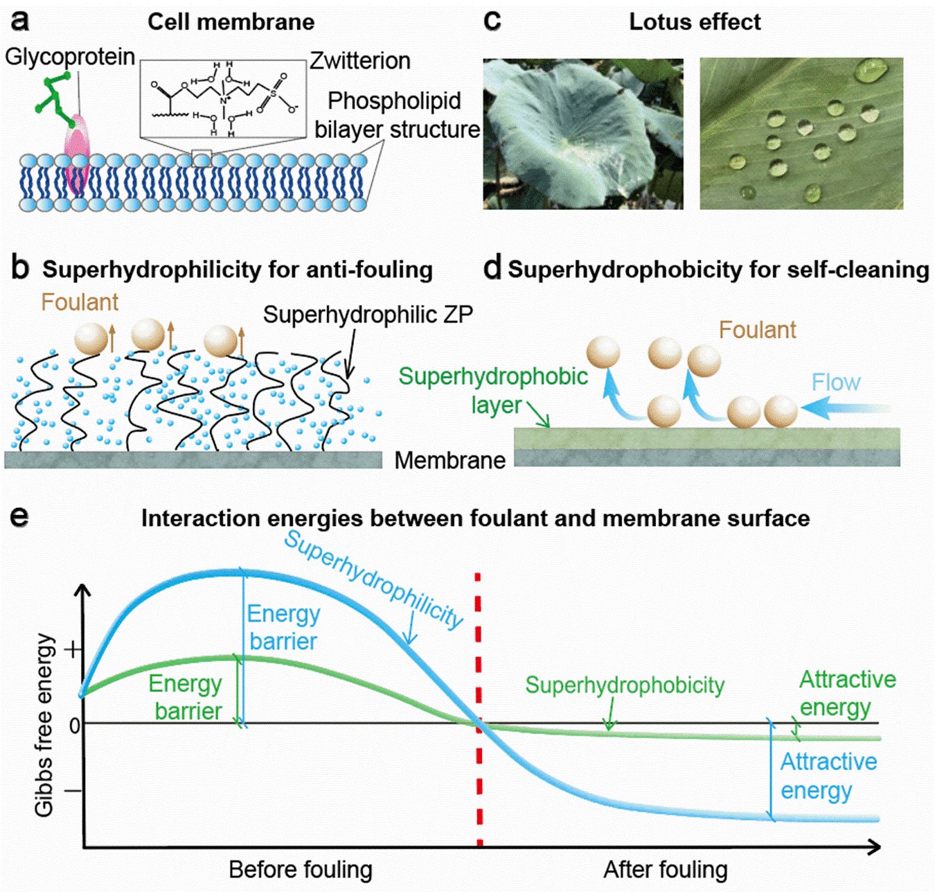 图1 膜表面浸润性对污染与清洗的影响。(a)仿生细胞膜;(b)超亲水膜高抗污染;(c)荷叶效应;(d)超疏水膜自清洁;(e)“污染物-膜”界面作用能。