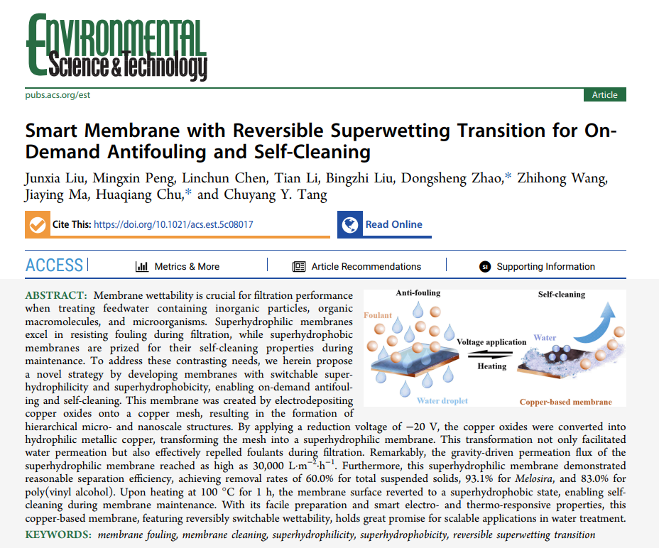 我院市政工程专业学子在环境领域顶刊“ES&T”发表最新研究成果:超浸润智能转换实现膜“抗污染与自清洁”兼得