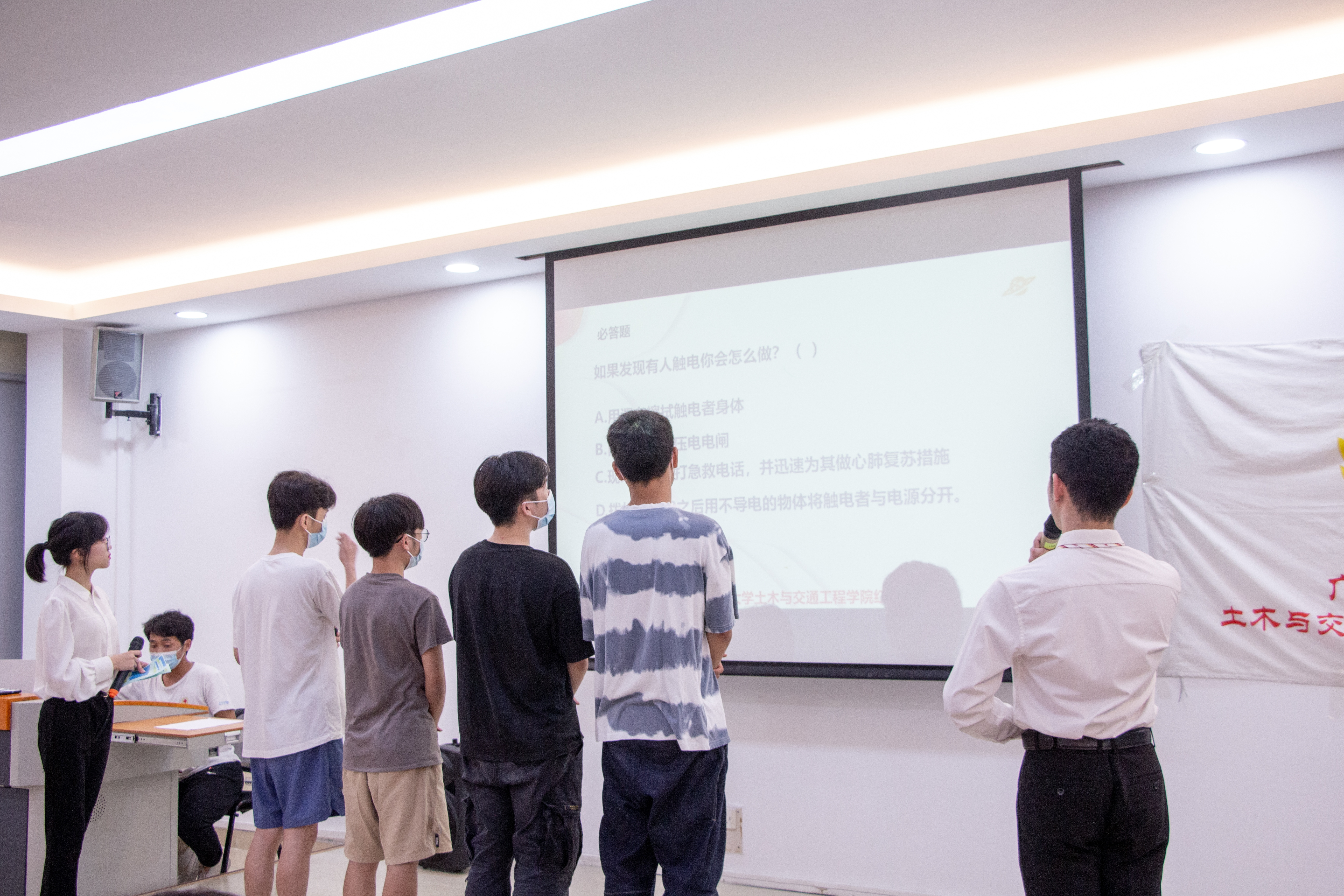 首先是必答环节,在主持人的引导下,每支队伍依次上台作答。在必答环节中,同学们一起巩固了防范新型冠状病毒的日常措施,了解了溺水的急救方法,献血的基本常识,运动急救技巧等内容,还学会了如何正确应对如扭伤,烧伤,触电等突发状况。观众们也从中学习到了很多医疗知识,并在有奖问答环节中积极抢答。