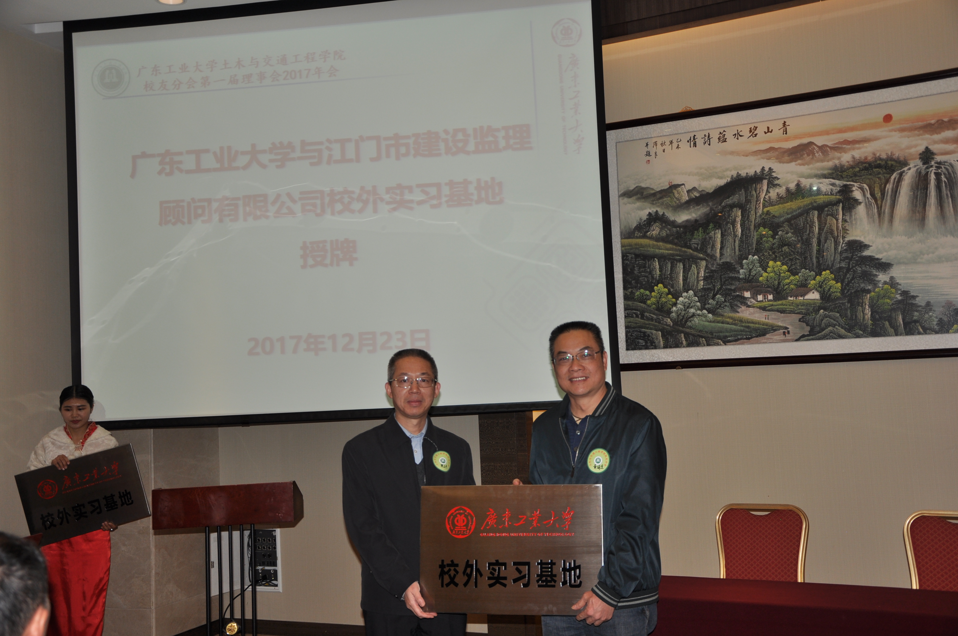 大会上举行了校外实习基地签约及授牌仪式。学校教务处处长李丽娟教授代表学校与江门市建设监理顾问有限公司总经理黄国生、广东蓬江建筑设计院有限公司院长薛峰、江门市交通工程建设有限公司副总经理廖志聪进行签约仪式;陈立中副校长向江门市建设监理顾问有限公司、广东蓬江建筑设计院有限公司、江门市交通工程建设有限公司授校外实习基地牌匾,黄国生先生、薛峰先生、廖志聪先生代表公司接牌。