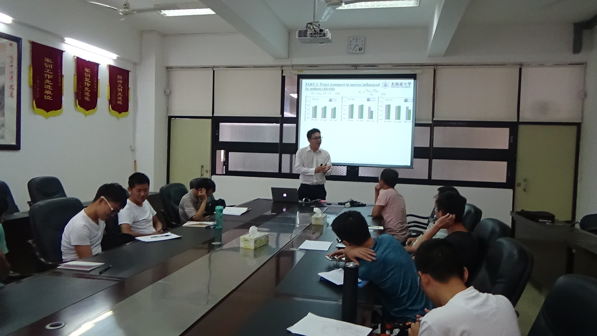 汪毅博士首先介绍了混凝土在北方圈寒冷地区由于冻融破坏给道路、桥梁和人行道所带来的影响和危害,目前解决混凝土冻融破坏的常见方法以及存在的不足,然后详细介绍了自己从细观角度出发探索水泥砂浆盐冻破坏机理,提出彻底解决北方圈混凝土盐冻问题的方法,并建立混凝土材料力学性能退化预测模型以及评估方法,理论模型与评估方法经过验证与实验结果具有较好的相吻度。讲座结束汪毅博士与现场师生进行了交流,就混凝土在极寒状态下的细微结构差异,水体结冰过程中盐溶变化,模型构建中参数的选取等问题等跟与会者进行了热烈讨论和交流。