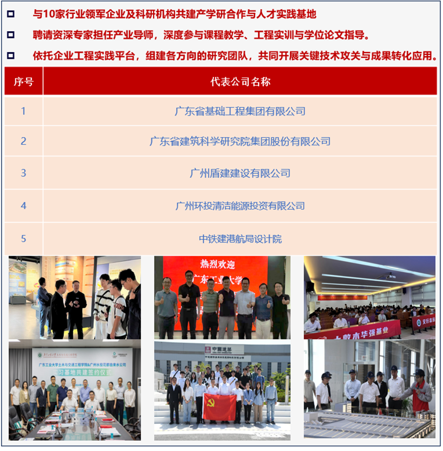 与广东省基础工程集团有限公司、广东省建筑科学研究院集团股份有限公司、广州盾建建设有限公司等10家行业领军企业及科研机构共建了产学研合作与人才实践基地,为研究生参与重大工程实践和创新研究提供了坚实平台。长期聘请大型设计院、工程局的总工程师和资深专家担任产业导师,深度参与课程教学、工程实训与学位论文指导,有效提升学生解决复杂岩土工程问题的职业能力。依托企业工程实践平台,组建地下工程智能建造、地质灾害预警等方向的研究团队,共同开展关键技术攻关与成果转化应用。