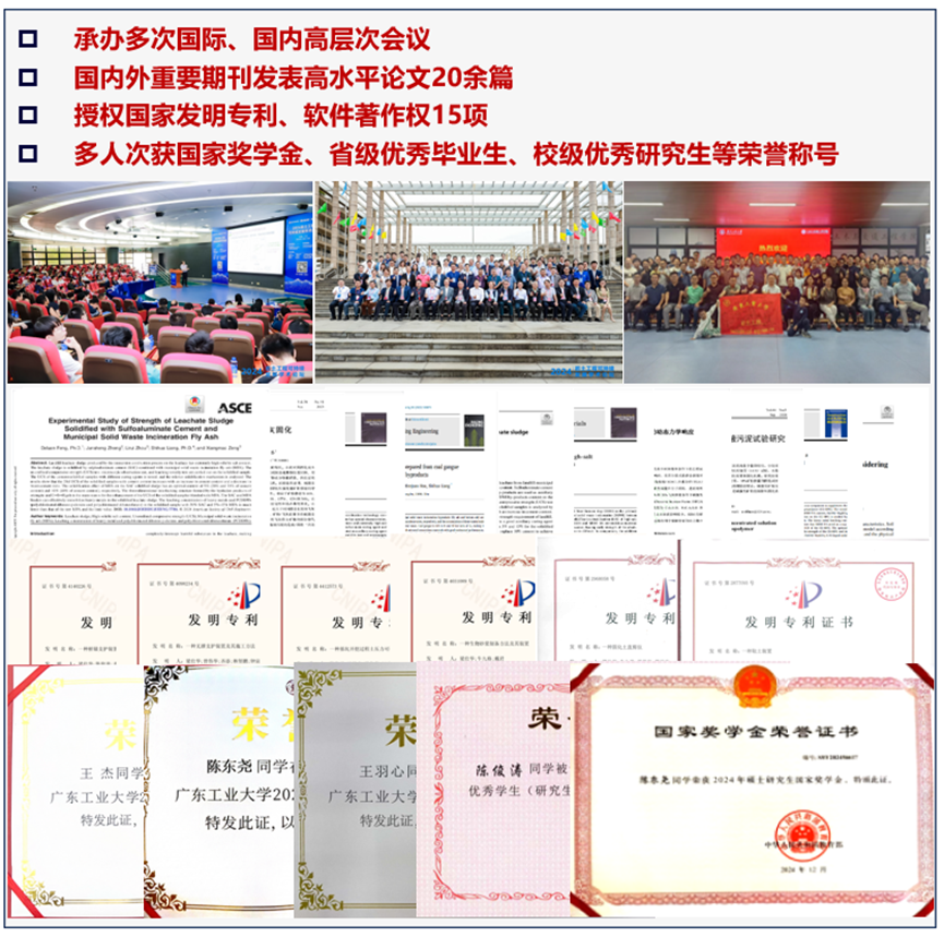 近五年来承担国家级14项、省部级18项、市厅级5项及重大横向课题40余项,研究经费1500余万元。涉及的课题有高度、接地气,为大湾区的基础设施建设发展提供了有效助力。在岩土学科领域累计发表论文600余篇,其中获得年度百篇最影响国内学术论文1篇,中国精品科技期刊顶尖学术论文2篇,高被引论文10篇。目前在岩土学科领域授权专利100余项,其中发明专利40余项。科研成果获教育部科学技术进步一等奖1项,湖北省科学技术进步奖一等奖1项,广东省科技进步奖二等奖2项,省级协会科技进步奖11项。